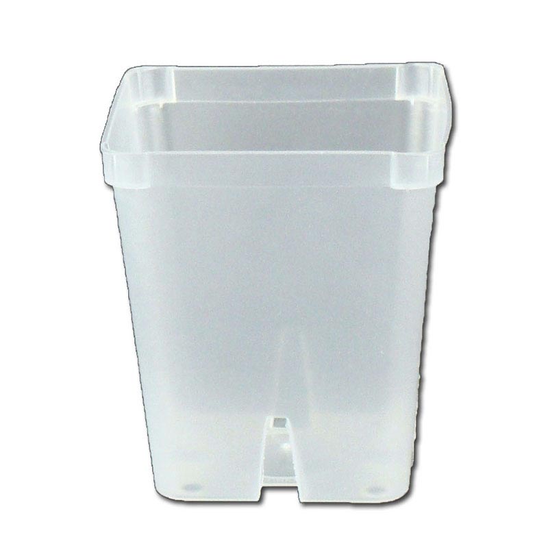 Our Square Pots has a slight rim, and each gently rounded corner has a slight extension for ease of handling and stacking. These nice sized square pots have excellent drainage with four round drainage holes at the bottom, a slightly raised center dome at the base and additional slanted side drainage ports from the bottom that extend up the side about 1 inch. The inside base of this generously sized pot is distinguished by these side slots which help promotes air and water flow. This is a nice moderate sized square pot for maximizing space while retaining important drainage and clarity. It stands 4" tall.
