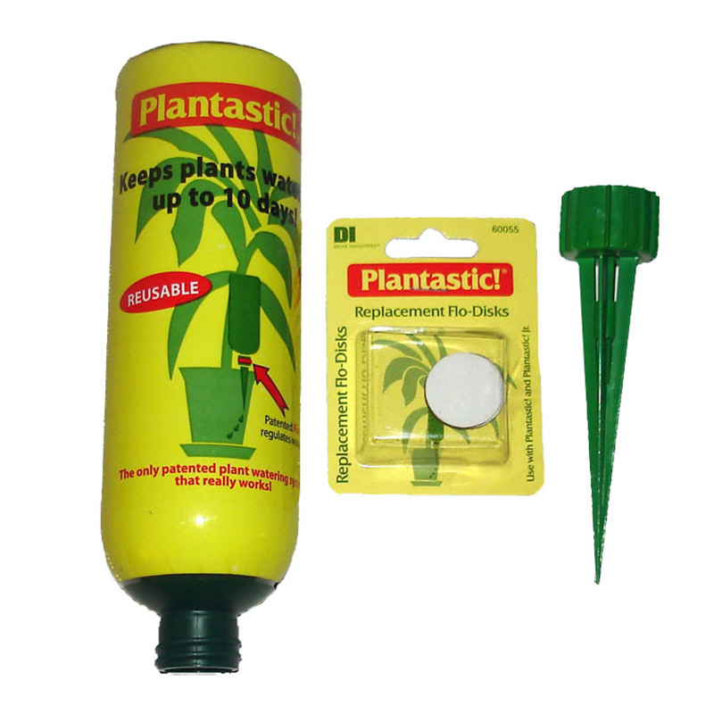 Enter Plantastic! This easy to use reusable and amazingly effective little tool does the work while you are away and does it perfectly. Water flow is governed by a small disk which evenly modulates the release of moisture to the potted plant from the 16 oz reservoir. It can keep your plant watered for 2 weeks or more, and the flow disks can be flipped or doubled up to reduce flow further if you prefer to provide a bit less water to certain plants.